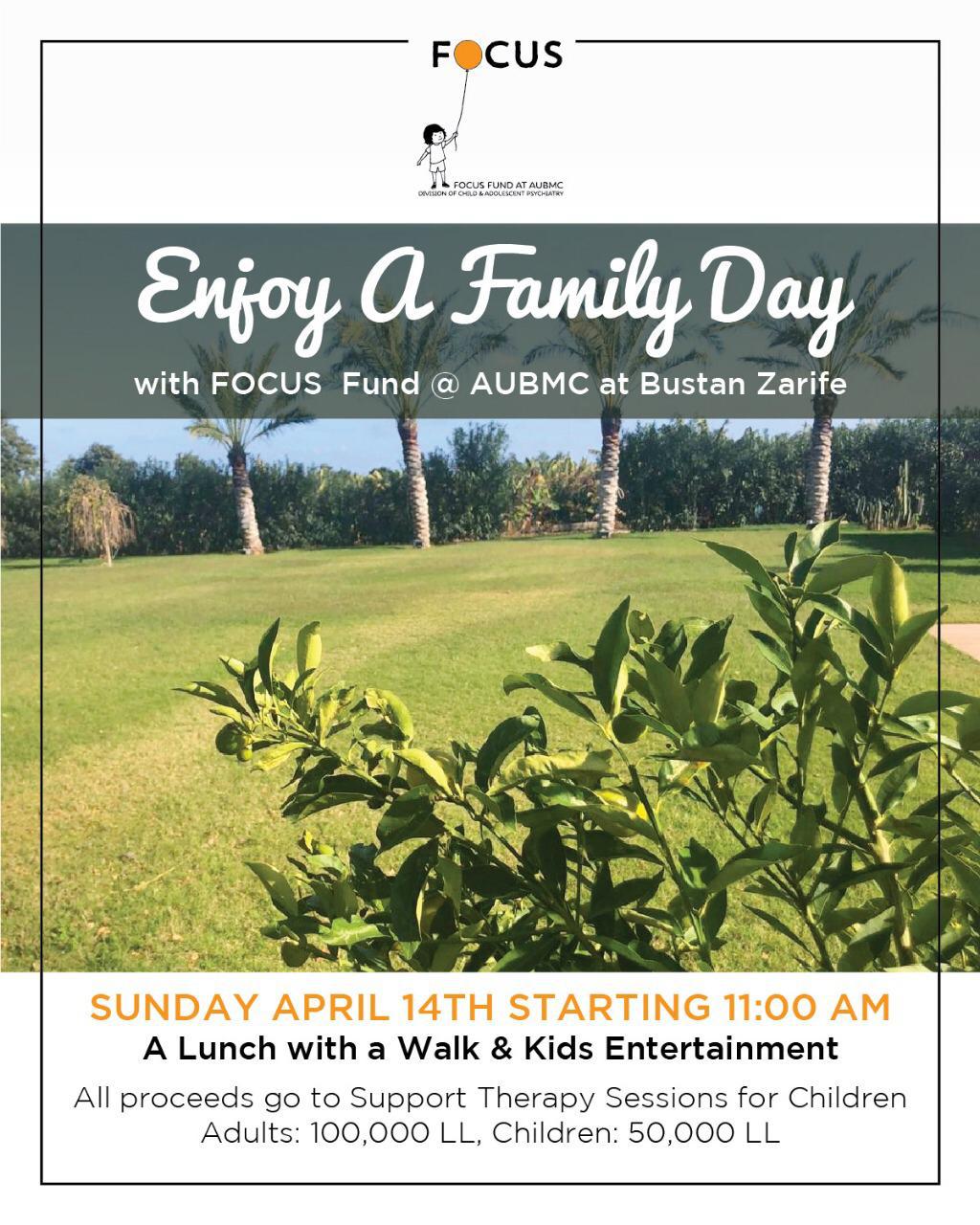 Come join us to enjoy a family day with FOCUS Fund @ AUBMC at Bustan Zarife on Sunday, April 14th, 2019 Starting 11:00am. Enjoy the walk in Nature, Lunch, family activities, and kids entertainment. All proceeds will go to support therapy sessions for children.
